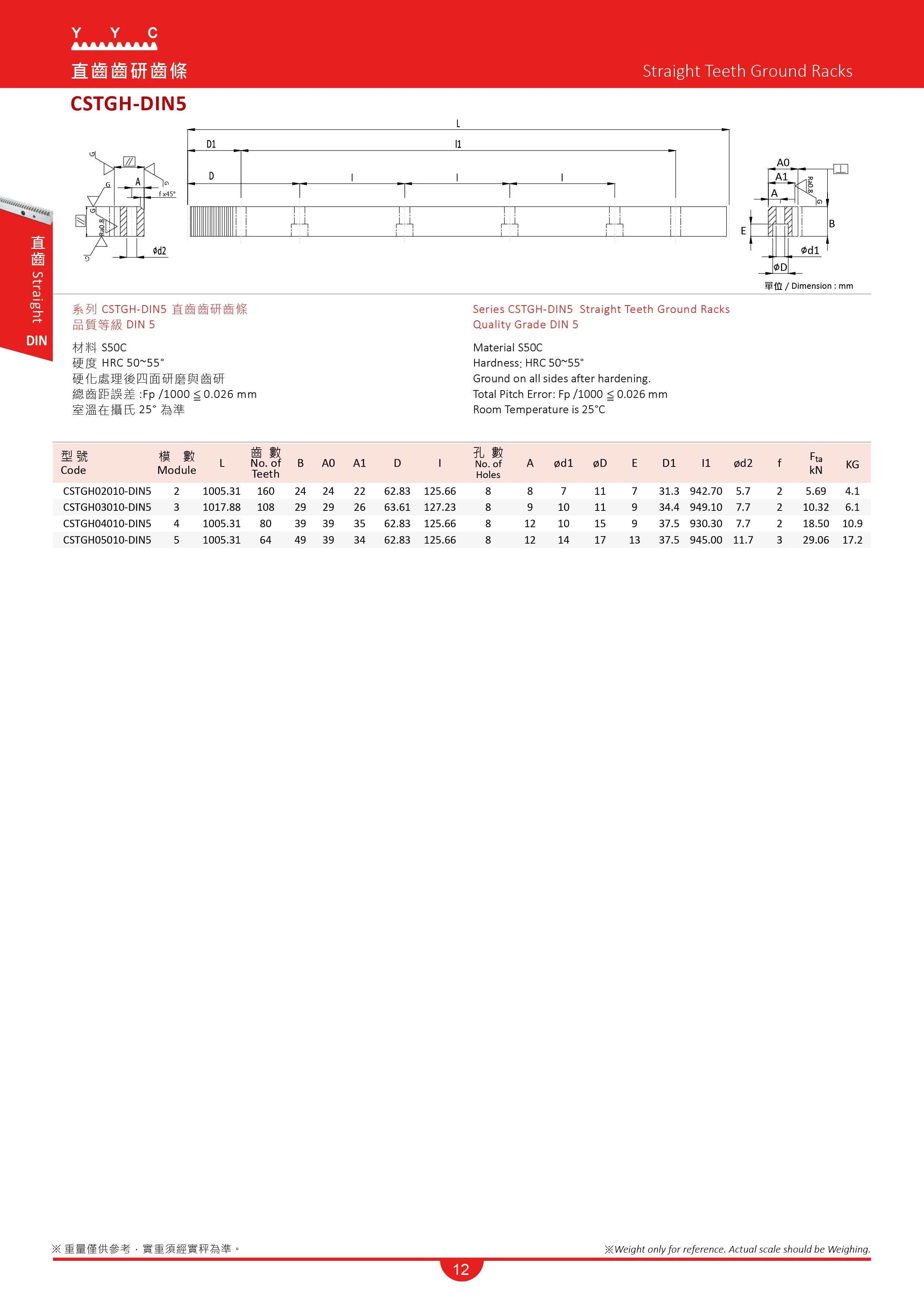 CSTGH-DIN5 直齿齿研齿条,采用中碳钢S50C,齿面经过热处理后,齿面硬度达到HRC50~55度,再进行齿面研磨和四面研磨等工序,在恒温25°c,齿条每米的总齿距误差,可以精准控制在0.026mm以内,属于极高度精密的传动零件。