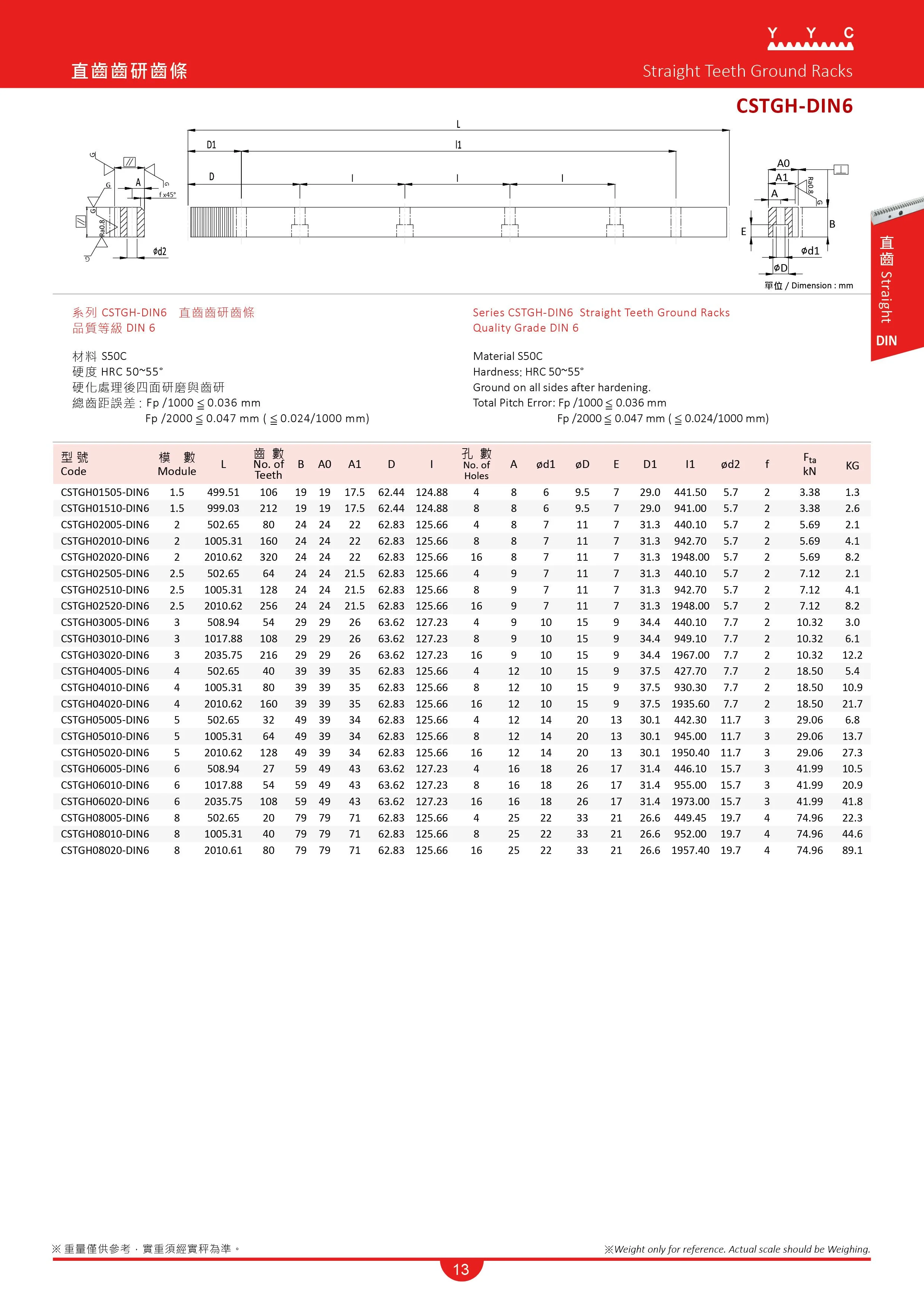 CSTGH-DIN6 直齿齿研齿条,采用中碳钢S50C,齿面经过热处理后,齿面硬度达到HRC50~55度,再进行齿面研磨和四面研磨等工序,齿条每米的总齿距误差,可以精准控制在0.036mm以内。